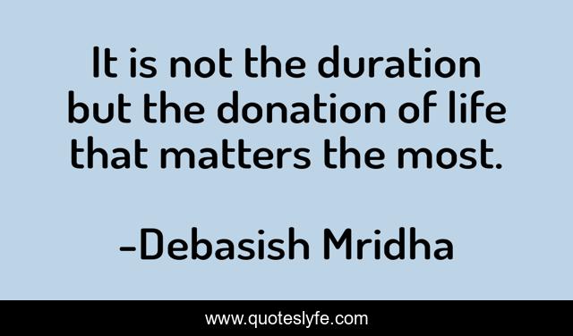 This page presents the quote "It is not the duration but the donation of life that matters the most.". Author of this quote is Debasish Mridha. This quote is about what-matters-in-life, philosophy, debasish-mridha, quotes, duration-of-life, inspirational, enthusiasm, donation-of-life, debasish-mridha-m-d,.