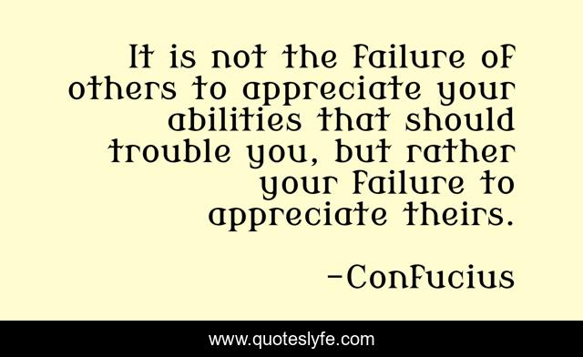 This page presents the quote "It is not the failure of others to appreciate your abilities that should trouble you, but rather your failure to appreciate theirs.". Author of this quote is Confucius. This quote is about enthusiasm, inspirational,.