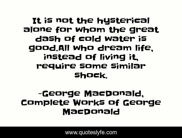 This page presents the quote "It is not the hysterical alone for whom the great dash of cold water is good.All who dream life, instead of living it, require some similar shock.". Author of this quote is George MacDonald, Complete Works of George MacDonald. This quote is about shock, what-s-mine-s-mine, george-macdonald, dreaming,.