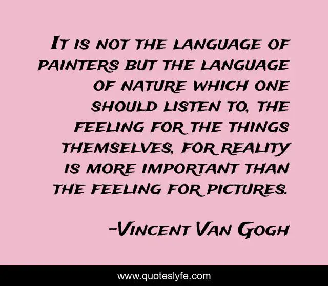 This page presents the quote "It is not the language of painters but the language of nature which one should listen to, the feeling for the things themselves, for reality is more important than the feeling for pictures.". Author of this quote is Vincent Van Gogh. This quote is about reality, language, listen,.