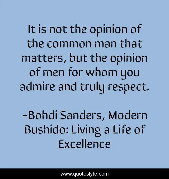 This page presents the quote "It is not the opinion of the common man that matters, but the opinion of men for whom you admire and truly respect.". Author of this quote is Bohdi Sanders, Modern Bushido: Living a Life of Excellence. This quote is about opinions, opinions-of-others, bohdi-sanders, respect,.