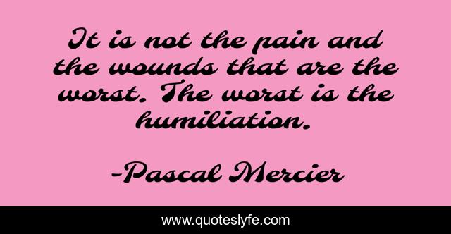 This page presents the quote "It is not the pain and the wounds that are the worst. The worst is the humiliation.". Author of this quote is Pascal Mercier. This quote is about pain, humiliation,.