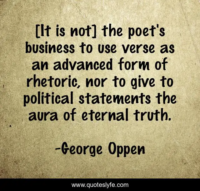 This page presents the quote "[It is not] the poet's business to use verse as an advanced form of rhetoric, nor to give to political statements the aura of eternal truth.". Author of this quote is George Oppen. This quote is about rhetoric, george-oppen, political, poetry, truth,.