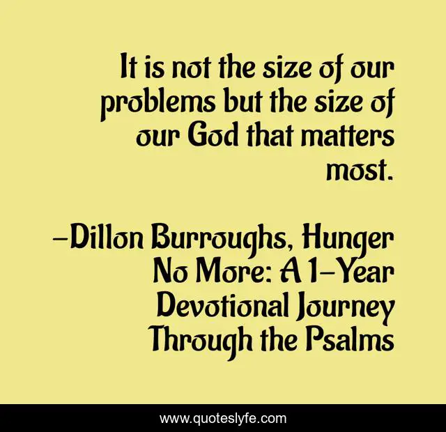 This page presents the quote "It is not the size of our problems but the size of our God that matters most.". Author of this quote is Dillon Burroughs, Hunger No More: A 1-Year Devotional Journey Through the Psalms. This quote is about god-s-strength, problems,.
