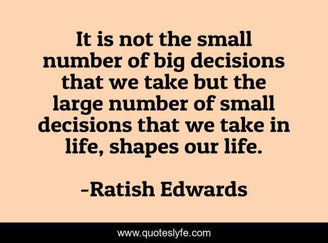 This page presents the quote "It is not the small number of big decisions that we take but the large number of small decisions that we take in life, shapes our life.". Author of this quote is Ratish Edwards. This quote is about descisions, living, life, from-the-book-of-edward,.