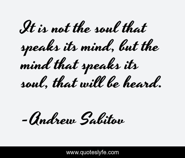 This page presents the quote "It is not the soul that speaks its mind, but the mind that speaks its soul, that will be heard.". Author of this quote is Andrew Sabitov. This quote is about hidden-messege, inspire, inspiration, behaviour, genius, attitude, truth, intelect, mindset,.