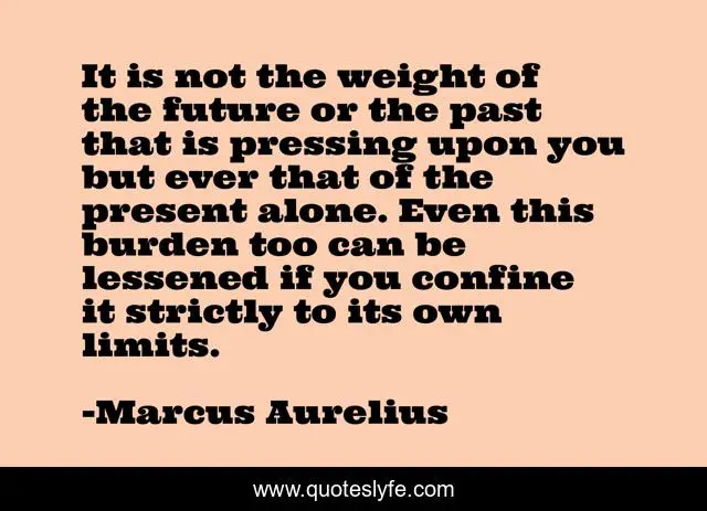 This page presents the quote "It is not the weight of the future or the past that is pressing upon you but ever that of the present alone. Even this burden too can be lessened if you confine it strictly to its own limits.". Author of this quote is Marcus Aurelius. .