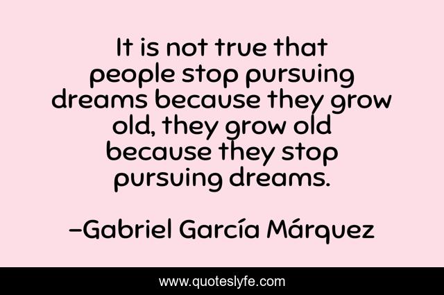 This page presents the quote "It is not true that people stop pursuing dreams because they grow old, they grow old because they stop pursuing dreams.". Author of this quote is Gabriel García Márquez. This quote is about disillusionment, aging-well, philosophy, growing-older,.