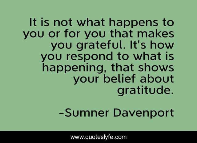 This page presents the quote "It is not what happens to you or for you that makes you grateful. It's how you respond to what is happening, that shows your belief about gratitude.". Author of this quote is Sumner Davenport. This quote is about gratitude, behaviour, attitude, belief, truth,.