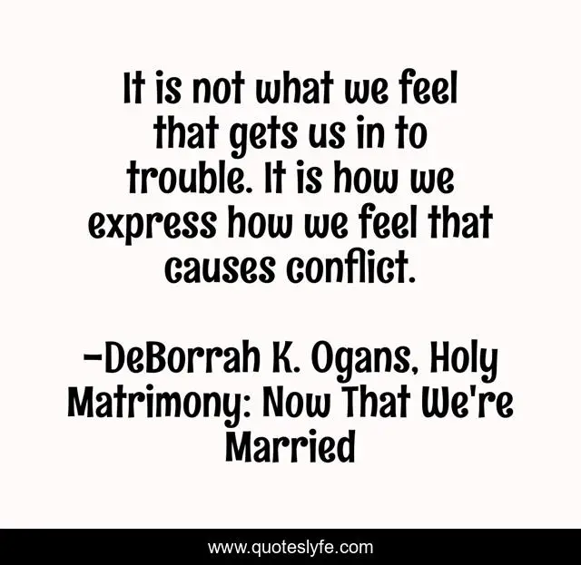 This page presents the quote "It is not what we feel that gets us in to trouble. It is how we express how we feel that causes conflict.". Author of this quote is DeBorrah K. Ogans, Holy Matrimony: Now That We're Married. This quote is about marriage, conflict,.