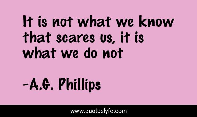 This page presents the quote "It is not what we know that scares us, it is what we do not". Author of this quote is A.G. Phillips. This quote is about enthusiasm, horror, scared, inspirational, philosophical-reflection,.