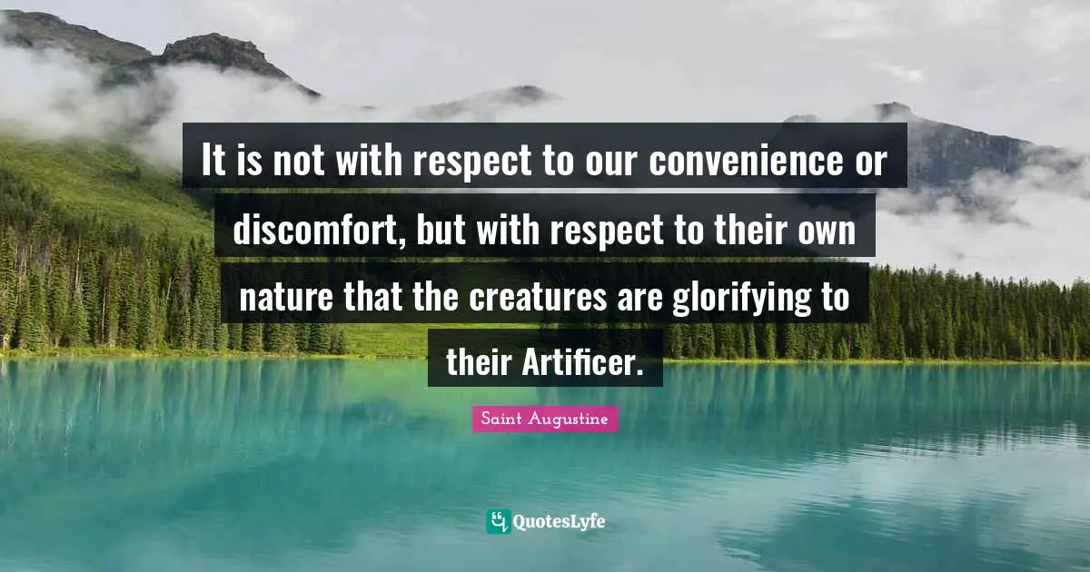 This page presents the quote "It is not with respect to our convenience or discomfort, but with respect to their own nature that the creatures are glorifying to their Artificer.". Author of this quote is Saint Augustine. This quote is about convenience, discomfort, creatures, respect, animal, nature,.
