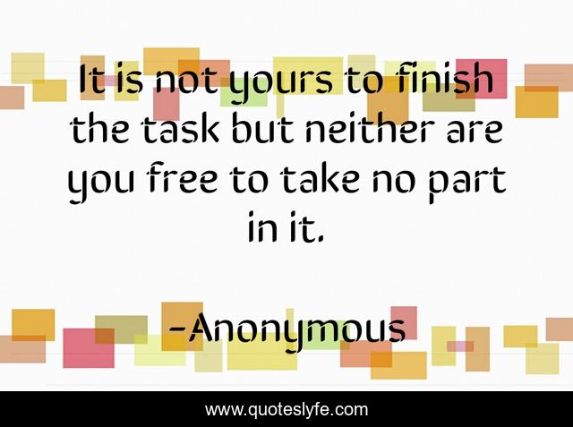 This page presents the quote "It is not yours to finish the task but neither are you free to take no part in it.". Author of this quote is Anonymous. .