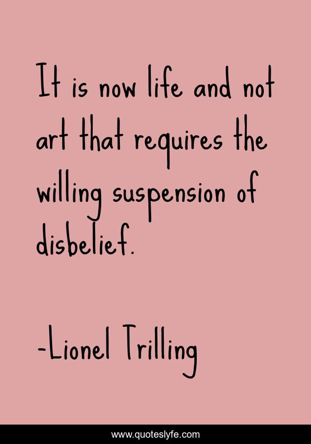 This page presents the quote "It is now life and not art that requires the willing suspension of disbelief.". Author of this quote is Lionel Trilling. .