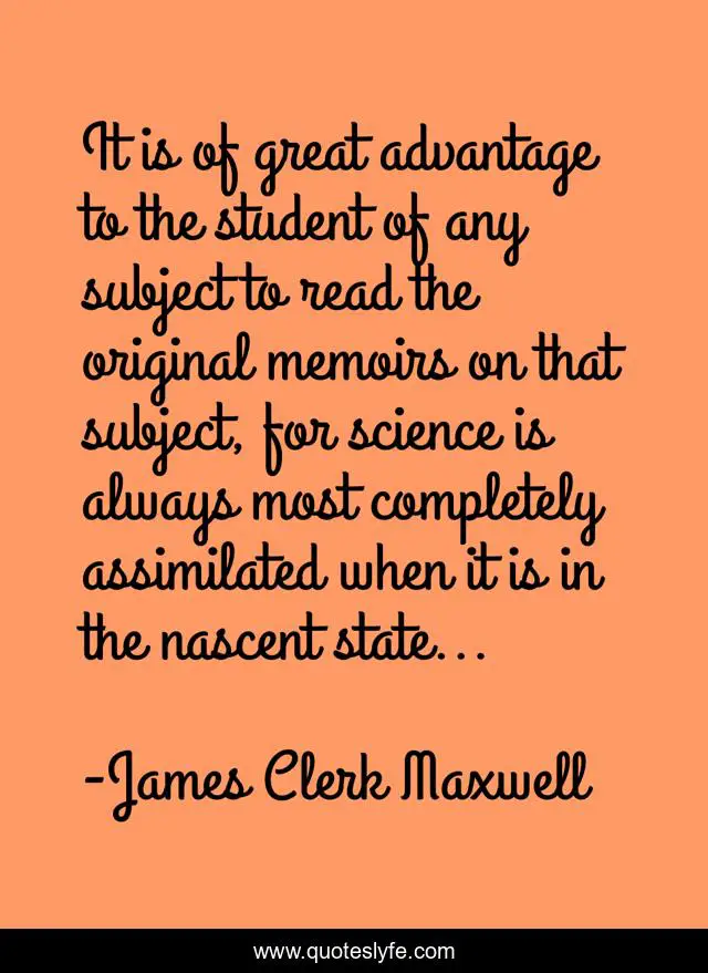 This page presents the quote "It is of great advantage to the student of any subject to read the original memoirs on that subject, for science is always most completely assimilated when it is in the nascent state...". Author of this quote is James Clerk Maxwell. This quote is about science, aadvantage,.