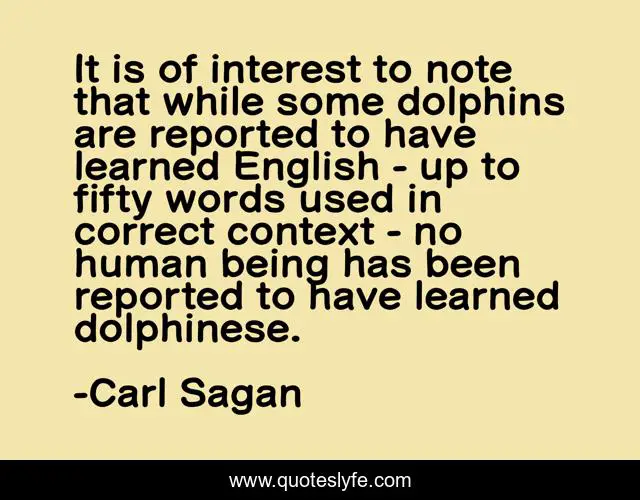 This page presents the quote "It is of interest to note that while some dolphins are reported to have learned English - up to fifty words used in correct context - no human being has been reported to have learned dolphinese.". Author of this quote is Carl Sagan. .
