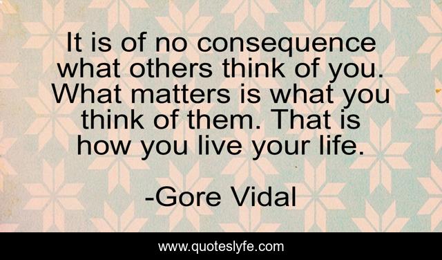 This page presents the quote "It is of no consequence what others think of you. What matters is what you think of them. That is how you live your life.". Author of this quote is Gore Vidal. This quote is about charlie-rose-show, life-philosophy, opinions-of-others,.
