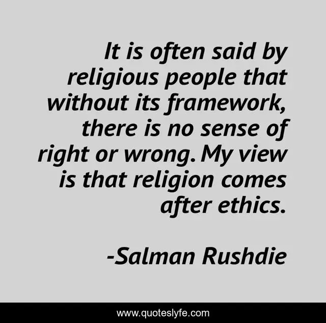 This page presents the quote "It is often said by religious people that without its framework, there is no sense of right or wrong. My view is that religion comes after ethics.". Author of this quote is Salman Rushdie. This quote is about ethics, people, view,.