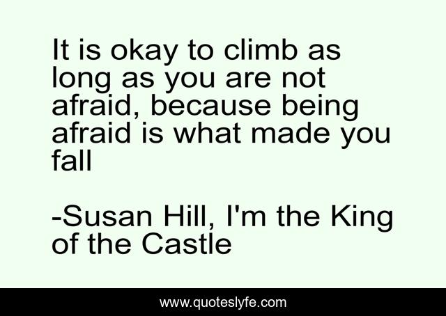 This page presents the quote "It is okay to climb as long as you are not afraid, because being afraid is what made you fall". Author of this quote is Susan Hill, I'm the King of the Castle. This quote is about enthusiasm, bravery, inspirational,.