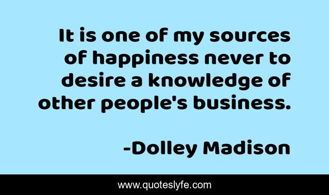 This page presents the quote "It is one of my sources of happiness never to desire a knowledge of other people's business.". Author of this quote is Dolley Madison. This quote is about knowledge, happiness, people,.