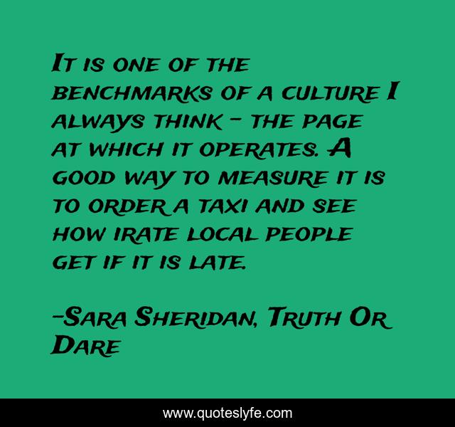 This page presents the quote "It is one of the benchmarks of a culture I always think – the page at which it operates. A good way to measure it is to order a taxi and see how irate local people get if it is late.". Author of this quote is Sara Sheridan, Truth Or Dare. This quote is about taxi, culture, humour, pace,.