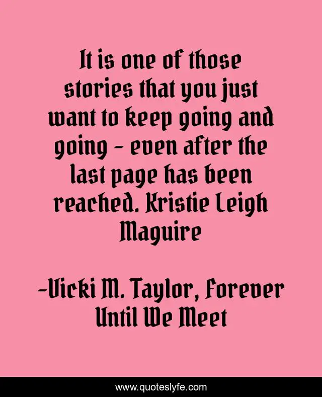 This page presents the quote "It is one of those stories that you just want to keep going and going - even after the last page has been reached. Kristie Leigh Maguire". Author of this quote is Vicki M. Taylor, Forever Until We Meet. This quote is about romance, unending, story, love, affection,.