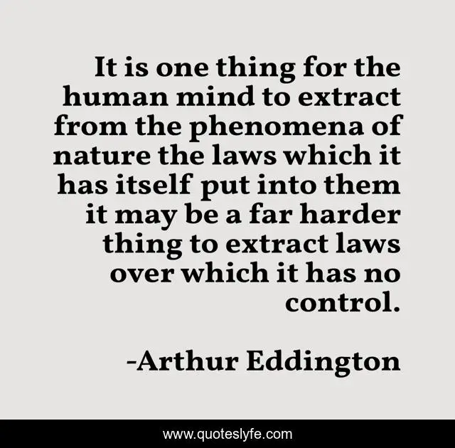This page presents the quote "It is one thing for the human mind to extract from the phenomena of nature the laws which it has itself put into them it may be a far harder thing to extract laws over which it has no control.". Author of this quote is Arthur Eddington. This quote is about control, mind, human,.