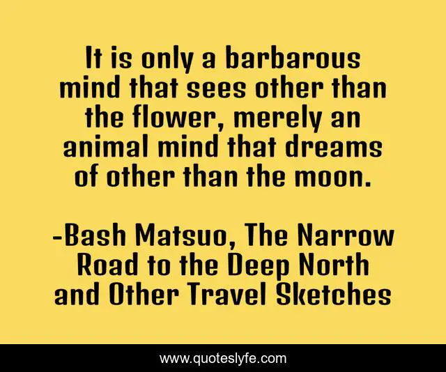 This page presents the quote "It is only a barbarous mind that sees other than the flower, merely an animal mind that dreams of other than the moon.". Author of this quote is Bashō Matsuo, The Narrow Road to the Deep North and Other Travel Sketches. This quote is about haiku, nature,.