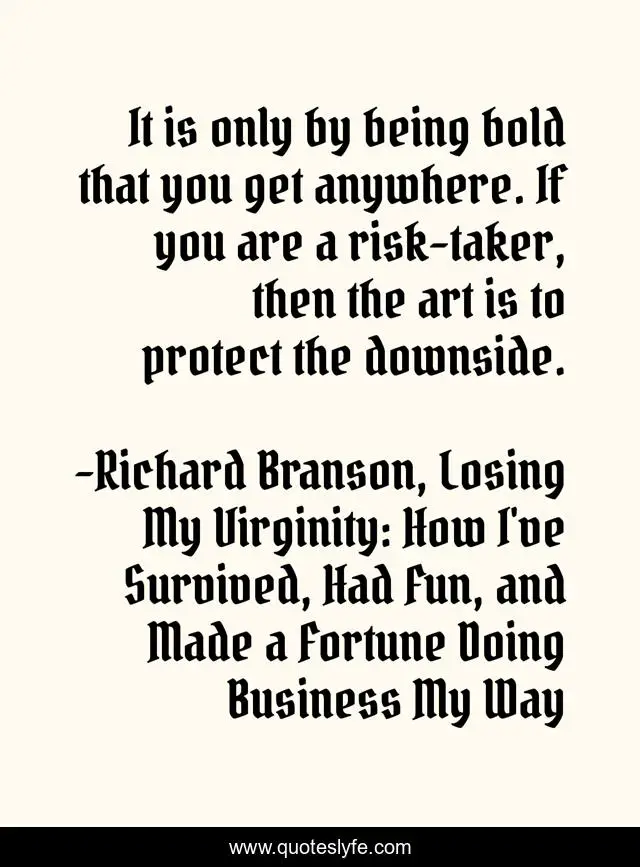 This page presents the quote "It is only by being bold that you get anywhere. If you are a risk-taker, then the art is to protect the downside.". Author of this quote is Richard Branson, Losing My Virginity: How I've Survived, Had Fun, and Made a Fortune Doing Business My Way. .