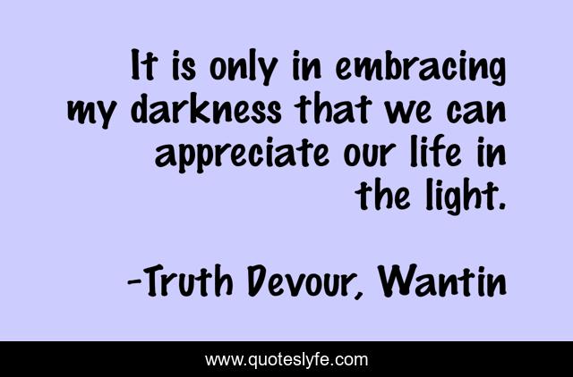 This page presents the quote "It is only in embracing my darkness that we can appreciate our life in the light.". Author of this quote is Truth Devour, Wantin. This quote is about life-lesson, light, darkness,.