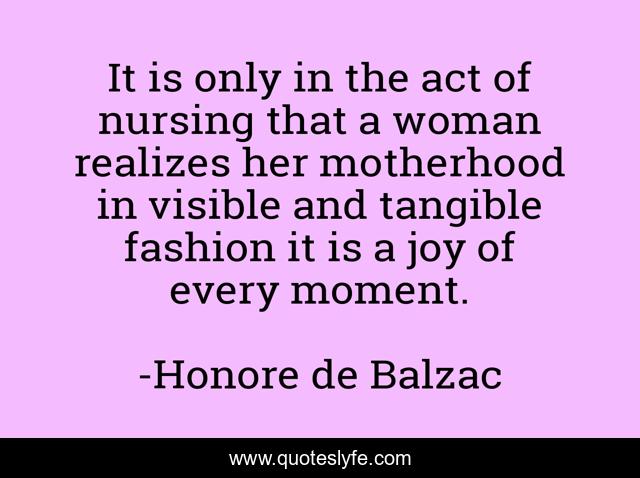 This page presents the quote "It is only in the act of nursing that a woman realizes her motherhood in visible and tangible fashion it is a joy of every moment.". Author of this quote is Honore de Balzac. This quote is about motherhood, woman, joy,.