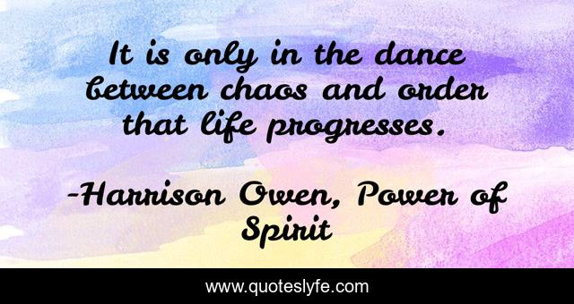 This page presents the quote "It is only in the dance between chaos and order that life progresses.". Author of this quote is Harrison Owen, Power of Spirit. This quote is about life, chaos, order,.