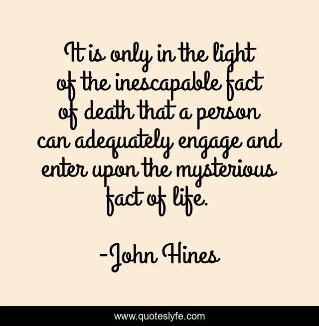 This page presents the quote "It is only in the light of the inescapable fact of death that a person can adequately engage and enter upon the mysterious fact of life.". Author of this quote is John Hines. This quote is about mysterious, light, life,.