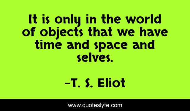 This page presents the quote "It is only in the world of objects that we have time and space and selves.". Author of this quote is T. S. Eliot. This quote is about world, brainy, time,.