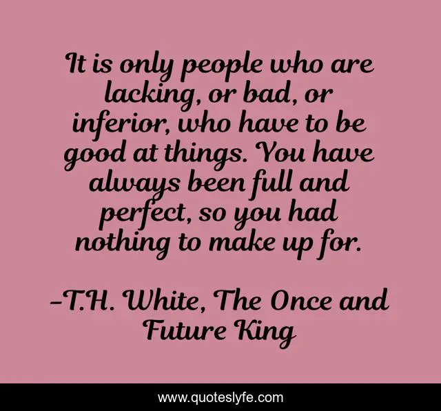 This page presents the quote "It is only people who are lacking, or bad, or inferior, who have to be good at things. You have always been full and perfect, so you had nothing to make up for.". Author of this quote is T.H. White, The Once and Future King. This quote is about wooing, love, humble, self-deprecating, inspirational, humility, enthusiasm, affection,.