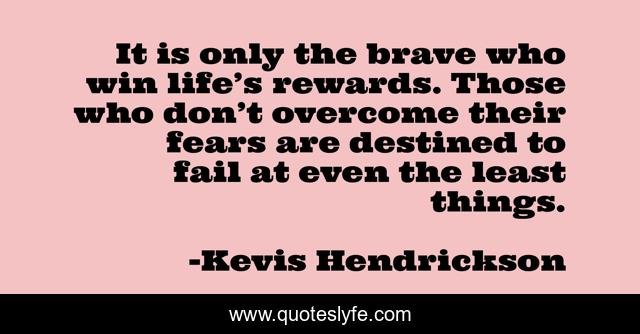 This page presents the quote "It is only the brave who win life’s rewards. Those who don’t overcome their fears are destined to fail at even the least things.". Author of this quote is Kevis Hendrickson. This quote is about enthusiasm, courage, the-tale-of-liril, inspirational, wisdom,.