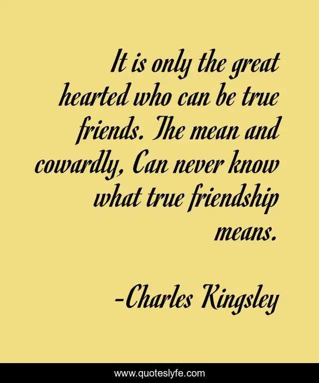 This page presents the quote "It is only the great hearted who can be true friends. The mean and cowardly, Can never know what true friendship means.". Author of this quote is Charles Kingsley. This quote is about friendship, friends,.