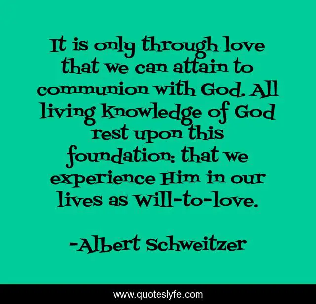 This page presents the quote "It is only through love that we can attain to communion with God. All living knowledge of God rest upon this foundation: that we experience Him in our lives as Will-to-love.". Author of this quote is Albert Schweitzer. .