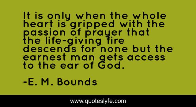 This page presents the quote "It is only when the whole heart is gripped with the passion of prayer that the life-giving fire descends for none but the earnest man gets access to the ear of God.". Author of this quote is E. M. Bounds. .