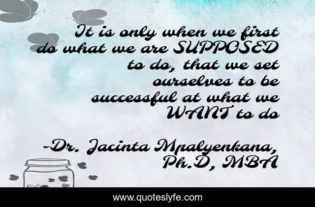 This page presents the quote "It is only when we first do what we are SUPPOSED to do, that we set ourselves to be successful at what we WANT to do". Author of this quote is Dr. Jacinta Mpalyenkana, Ph.D, MBA. This quote is about life, life-and-living, philosophy-of-life,.