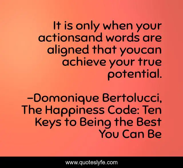 This page presents the quote "It is only when your actionsand words are aligned that youcan achieve your true potential.". Author of this quote is Domonique Bertolucci, The Happiness Code: Ten Keys to Being the Best You Can Be. This quote is about life-coaching, motivation, how-to-be-happier, life-coach, be-happy, how-to-be-happy, happiness-advice, happiness, be-more-motivated,.