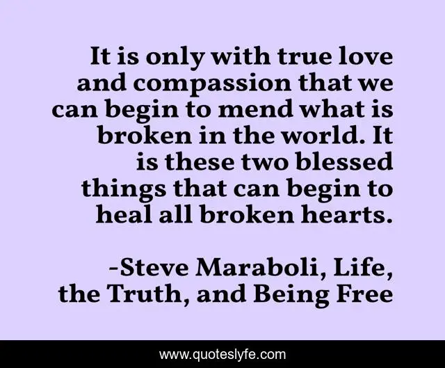 This page presents the quote "It is only with true love and compassion that we can begin to mend what is broken in the world. It is these two blessed things that can begin to heal all broken hearts.". Author of this quote is Steve Maraboli, Life, the Truth, and Being Free. This quote is about broken-heart, true-love, love, compassion, blessings, inspirational, enthusiasm, kindness, affection,.