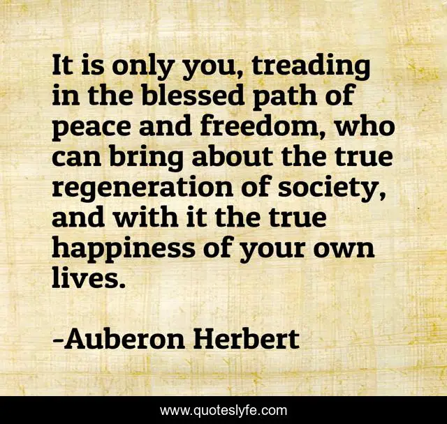 This page presents the quote "It is only you, treading in the blessed path of peace and freedom, who can bring about the true regeneration of society, and with it the true happiness of your own lives.". Author of this quote is Auberon Herbert. This quote is about freedom, statism, non-aggression-principle, liberty, anarchy, ancap, individual, libertarian, coercion,.