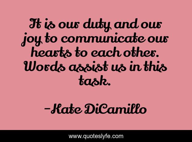 This page presents the quote "It is our duty and our joy to communicate our hearts to each other. Words assist us in this task.". Author of this quote is Kate DiCamillo. This quote is about vocabulary, verbage, reading, words,.