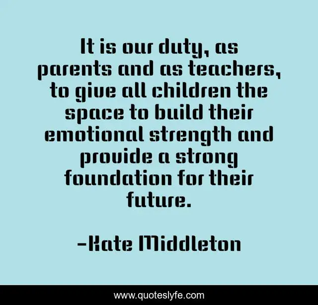 This page presents the quote "It is our duty, as parents and as teachers, to give all children the space to build their emotional strength and provide a strong foundation for their future.". Author of this quote is Kate Middleton. This quote is about future, strength, children,.