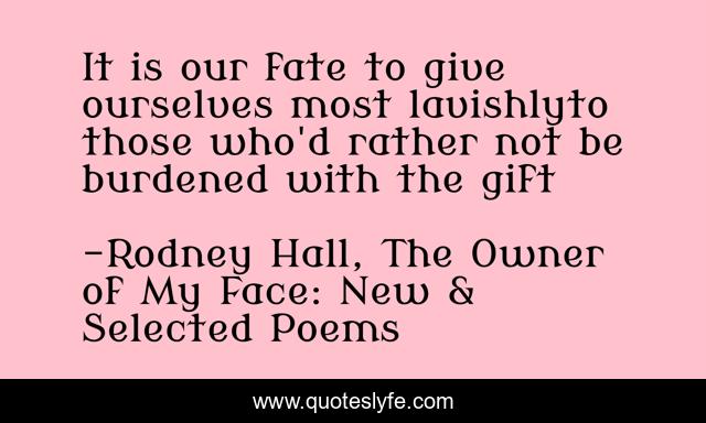 This page presents the quote "It is our fate to give ourselves most lavishlyto those who'd rather not be burdened with the gift". Author of this quote is Rodney Hall, The Owner of My Face: New & Selected Poems. .