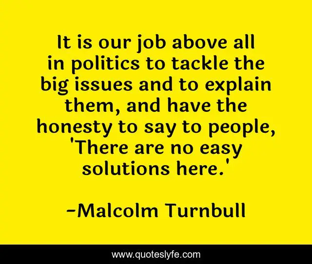 This page presents the quote "It is our job above all in politics to tackle the big issues and to explain them, and have the honesty to say to people, 'There are no easy solutions here.'". Author of this quote is Malcolm Turnbull. This quote is about job, honesty, people,.