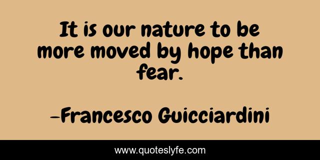 This page presents the quote "It is our nature to be more moved by hope than fear.". Author of this quote is Francesco Guicciardini. This quote is about progress, fear, hope,.