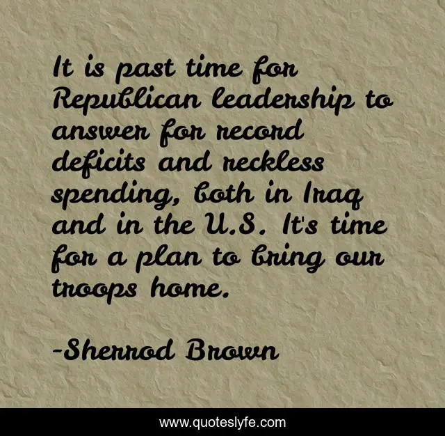 This page presents the quote "It is past time for Republican leadership to answer for record deficits and reckless spending, both in Iraq and in the U.S. It's time for a plan to bring our troops home.". Author of this quote is Sherrod Brown. This quote is about past, home, time,.