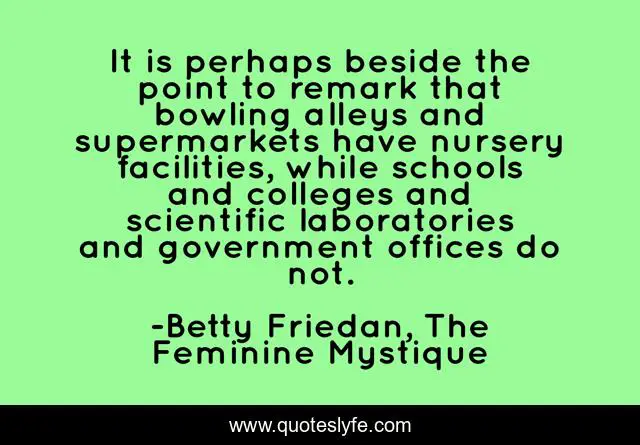 This page presents the quote "It is perhaps beside the point to remark that bowling alleys and supermarkets have nursery facilities, while schools and colleges and scientific laboratories and government offices do not.". Author of this quote is Betty Friedan, The Feminine Mystique. This quote is about feminism, wry-humor,.